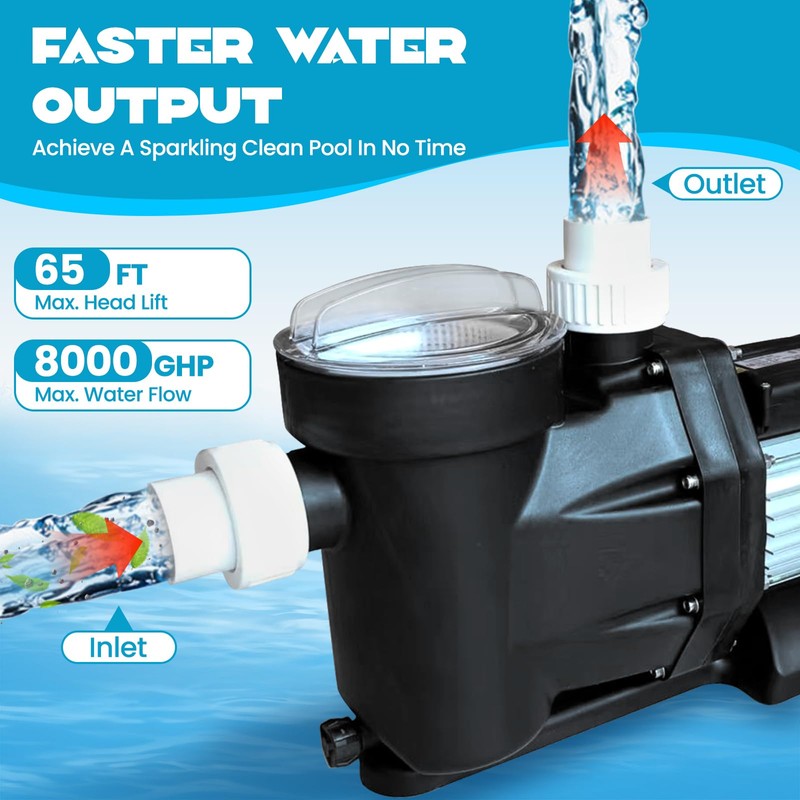 - 🏊 Powerful 1.5HP Pool Pump: Operating at 110V / 60 Hz, this pump features a robust IP55 1100W electric copper wire motor, delivering an impressive flow rate of up to 6160 GPH and a maximum head height of 65 feet, ensuring your pool remains crystal clear throughout the season.