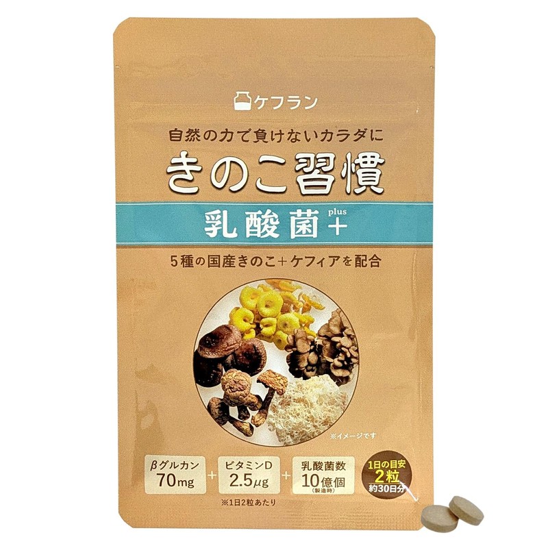 ケフラン きのこ習慣乳酸菌+ サプリ(1カ月分/60粒)(βグルカン/シイタケ菌糸体/エルゴチオネイン/ビタミンンD/日本ケフィア/国産きのこ使用/国内製造/粒タイプ)