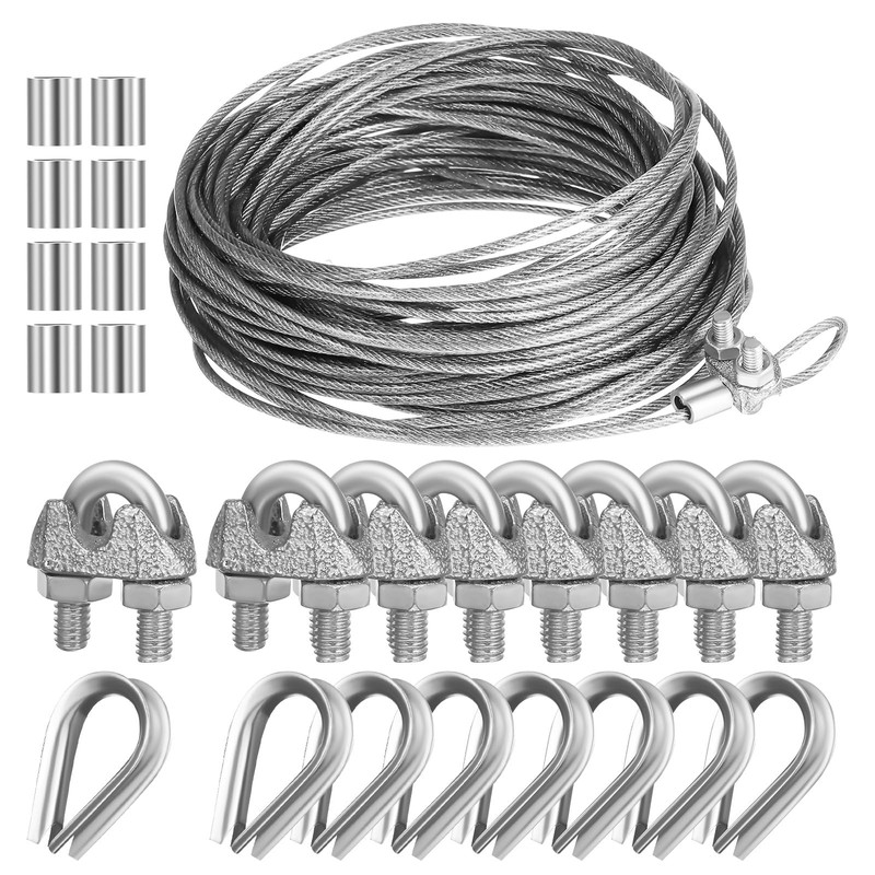 1/8" Wire Rope Kit - 50FT Steel Cable with Loop Sleeve, and Wire Rope Thimble - 7×7 Strands Aircraft Cable for Garden String Light Hanging, Yard Zipline, Deck Railing System