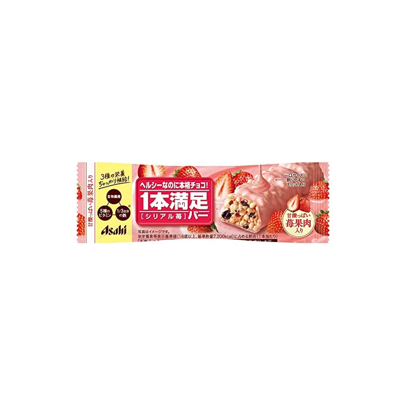 - 『1本満足バー シリアル苺』は、チョコレート市場の中でも人気の苺風味のチョコレートでコーティングしたシリアルバーです。甘酸っぱい苺の果肉入りで、レーズンのほのかな酸味がアクセントの爽やかな味わいです。1本当たり1/3日分の鉄、食物繊維、5種のビタミン※2を配合しています。バータイプなので手軽に栄養補給ができます。一口サイズに割りやすいスリット入りです。