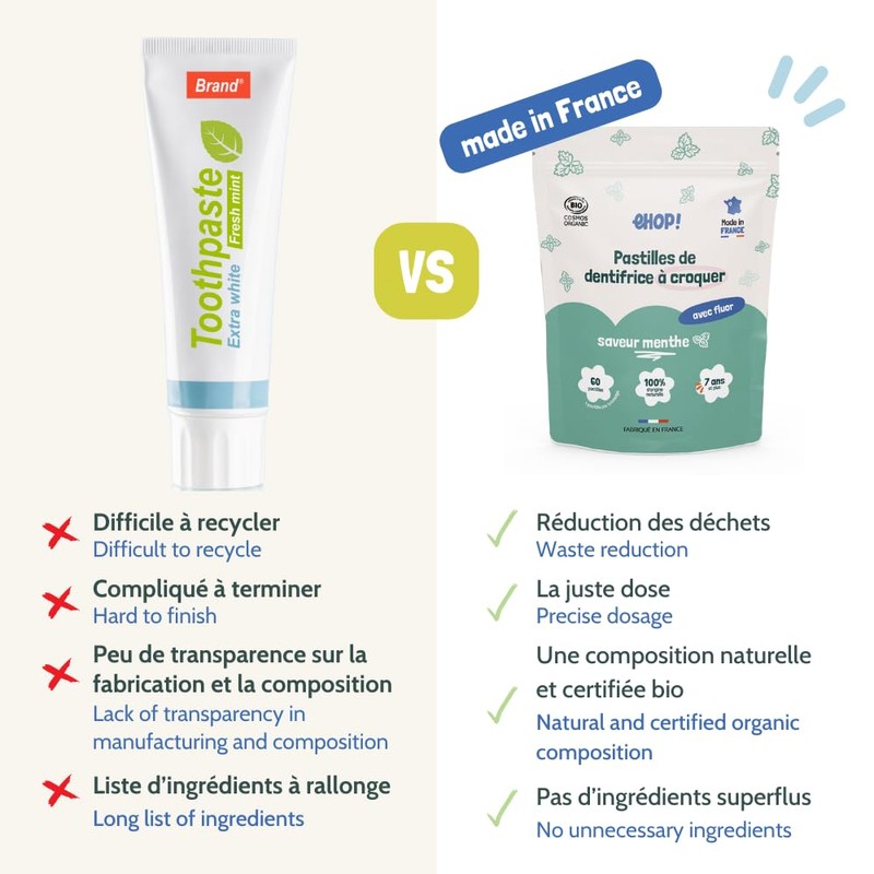 - 100% made in France: formulated with high-quality ingredients for environmentally friendly care of teeth and the environment.