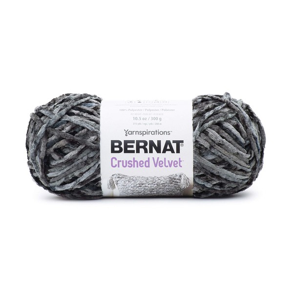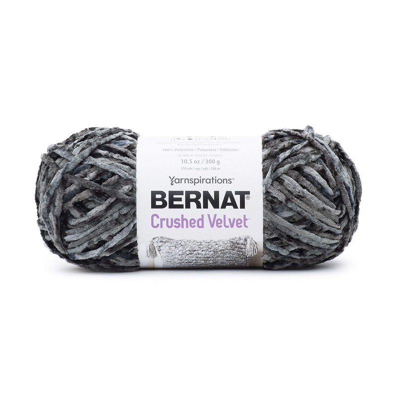 - Bernat crushed velvet is a luxuriously soft variegated yarn designed to create velvety soft multi-tonal projects. Knit or crochet statement pillows, lush blankets or accessories with this diverse yarn sure to stand out in any occasion. Its bulky weight stitches up quickly and when worked together with bernat velvet, it creates a beautiful multi-textural look. This 100% polyester Yarn is available in a wide range of solid and variegated shades, and should be hand-washed to ensure your projects last. Features: content: 100% polyester ball Size: 300 g/10.5 oz, 288 m/315 yds. Care: hand wash and hang to dry gauge: #5 bulky knitting Gauge: 15 STS and 25 rows with a 5 mm (U.S. 8) knitting needle Crochet Gauge: 12 SC and 14 rows with a 5.5 mm (U.S. I) crochet hook knitting Gauge: 4” x 4” (10 cm x 10 cm) 8 sts and 25 rows with a 5 mm knitting needle Crochet Gauge: 4” x 4” (10 cm x 10 cm) 12 sts and 14 rows with a 5.5 mm crochet hook recommended knitting needle: 5 mm recommended crochet hook: 5.5 mm