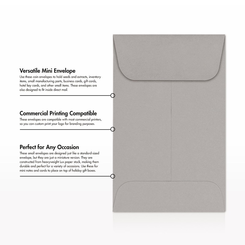 28lb. Gray Kraft #1 Coin Envelopes measure 2 ?? x 3 ?? (2.25 x 3.5 inches) and are a multipurpose envelope perfect for holding small items and collectables including coins, stamps, jewelry, manufacturing parts, inventory items, washers, bolts, nuts, screws, nails and more.
