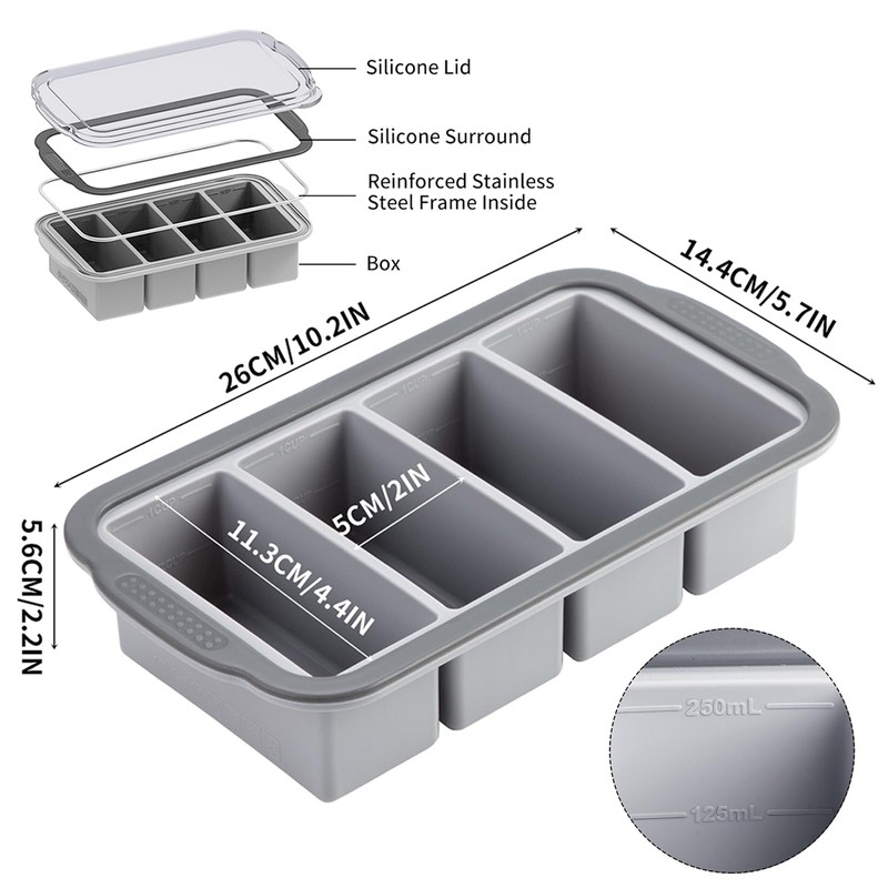 - Built-in Portion Control - Each compartment has four fill lines: ½ cup, 1 cup, 125 mL, 250 mL,making portioning simple.Each tray holds 4cups or 1000 lm and is great for storing and freezing soup, broth, sauce, and other liquid foods in measured amounts.