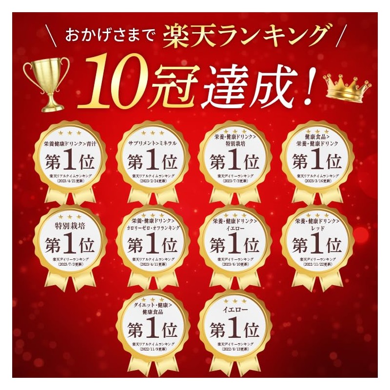 - オーガニック国産大麦若葉、約40種の野菜と果実、カルシウム、ビタミンD、乳酸菌、ビフィズス菌、フラクトオリゴ糖、食物繊維、βカロテン