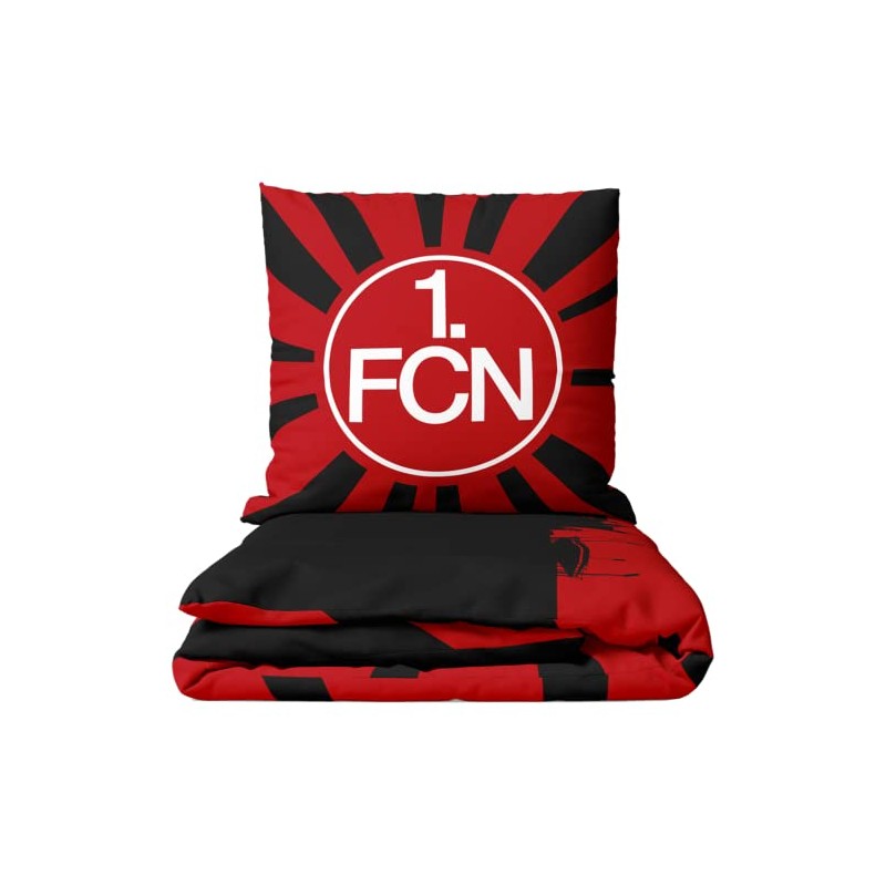 - Cuddly bed linen in red base colour, white FCN logo, black skyline of the city of Nuremberg and sunbeam pattern