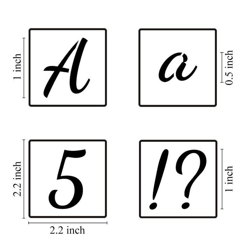- ☆ EASY TO USE: These stencils can save you a lot of time when creating crafts, you can customize words and numbers to create any art projects you want. You just put them on the surface of the object, paint with a brush or spray with a spray gun, simply do it! They are reusable, easy to clean with soap and water. The reasonable size is easy to store. Size: stencil 2.2"x 2.2", letter height: uppercase letter about 1", lowercase letter about 0.5".