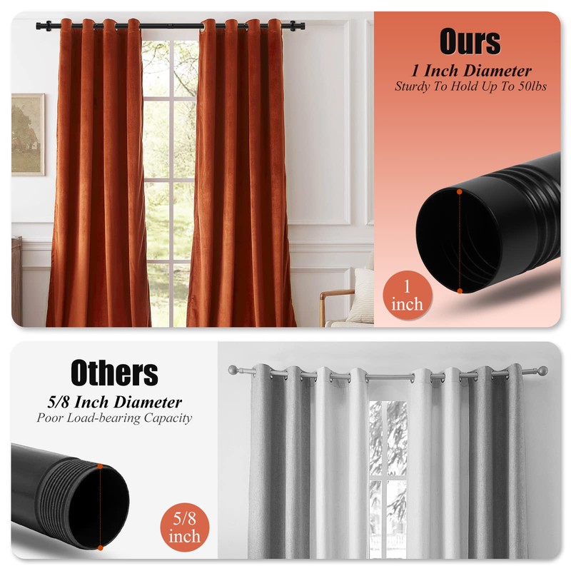 - For Heavy Fabrics. Bigger diameter and upgraded thicker poles allows our heavy duty curtain rods hold up to 50lbs. No worries even when you need to air dry the washed curtains.