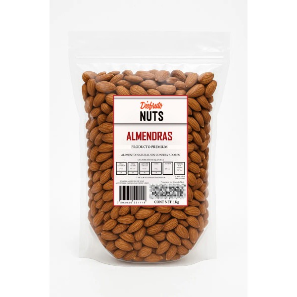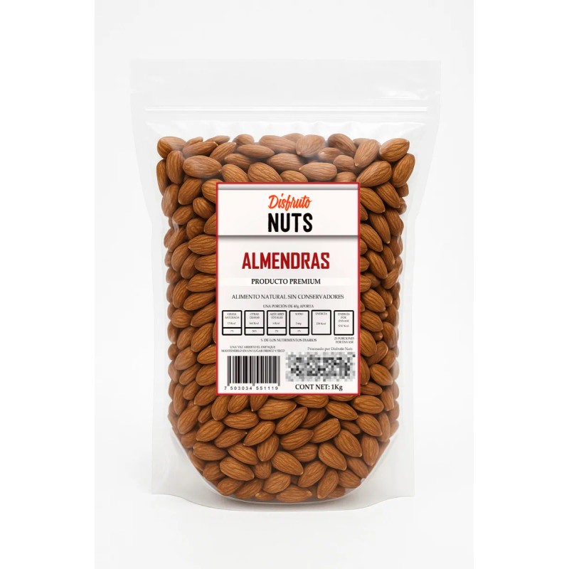 Almendra pelada entera natural, marca DISFRUTO NUTS. Contenido Neto 1000gr.