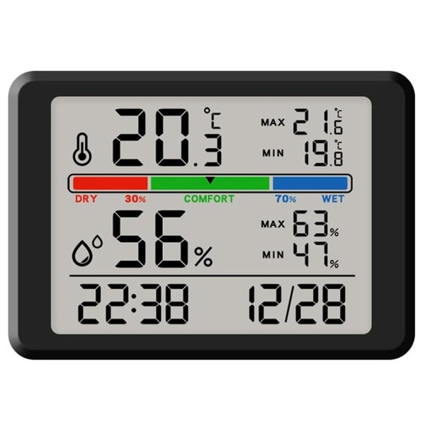 - バックライト付きの直感的なディスプレイ - 3.7インチのLCD画面を一目見れば、現在の温度、湿度、最大/最小記録、3色9レベルの空気快適なインジケータバー、時刻と日付を見ることができます。タッチコントロール15秒のバックライトで組み込まれているため、夜または薄暗い部屋で読み取り値を簡単に確認できます