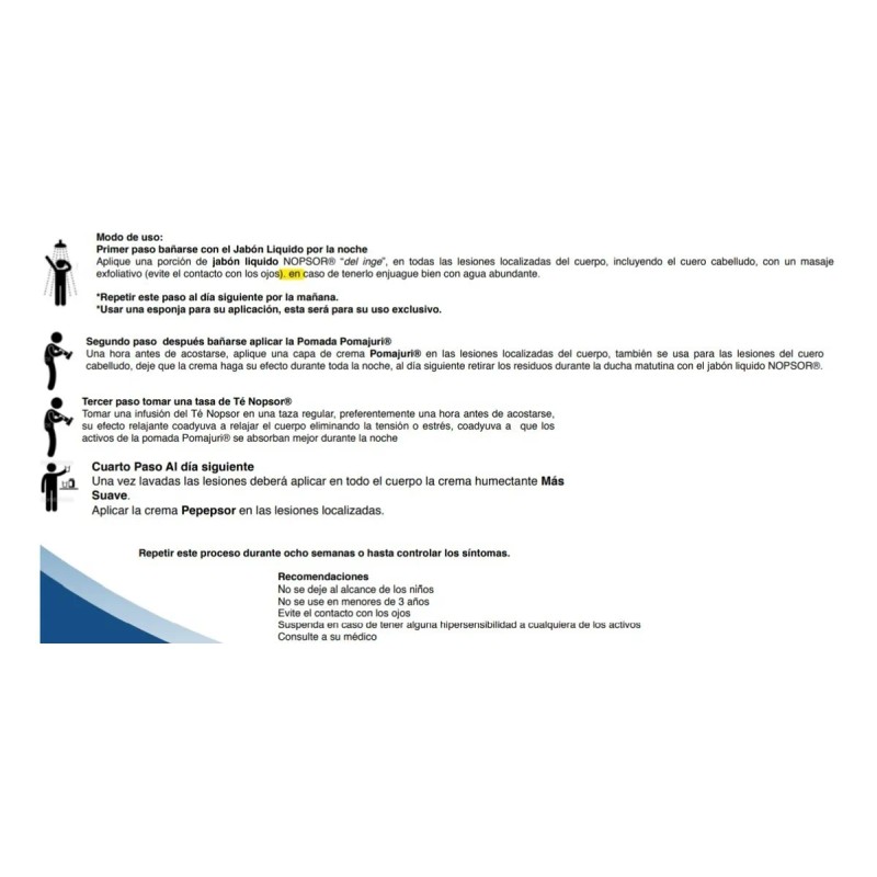 El combo Nopsor está diseñado como un tratamiento auxiliar completo para personas que padecen psoriasis, piel seca, dermatitis o irritación crónica tanto en el cuerpo como en el cuero cabelludo. Incluye un jabón sólido de uso diario y un shampoo especial que ayudan a aliviar síntomas como descamación, comezón, enrojecimiento y resequedad.
