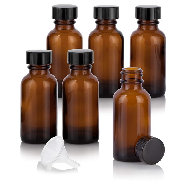 1 oz / 30 ml Amber Glass Boston Round Bottle with Airtight Phenolic Cap (6 Pack) + Funnel