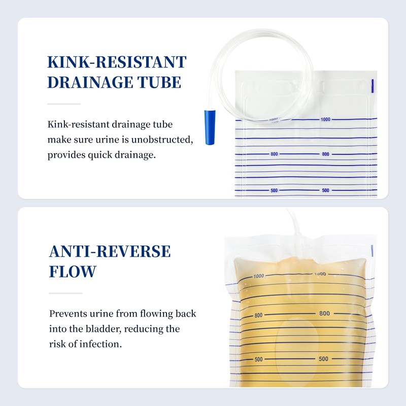 • Anti-Reflux Design - The urine bag features an anti-reflux valve that prevents urine from flowing back into the bladder, reducing the risk of infection.