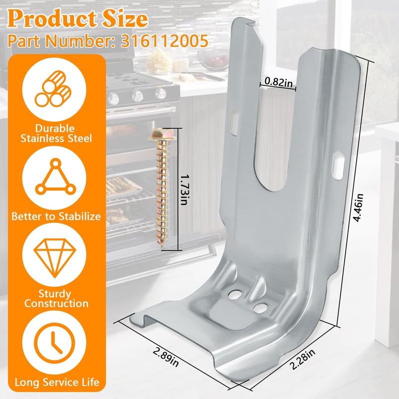 • 316112005 Range Anti-tip Bracket Kit: The range anti-tip bracket are installed on freestanding stove to prevent the range from falling forward or falling down, the bracket can solve problems like stove no tip bracket, stove anti tipper broken, anti-tip bracket does not match the machine