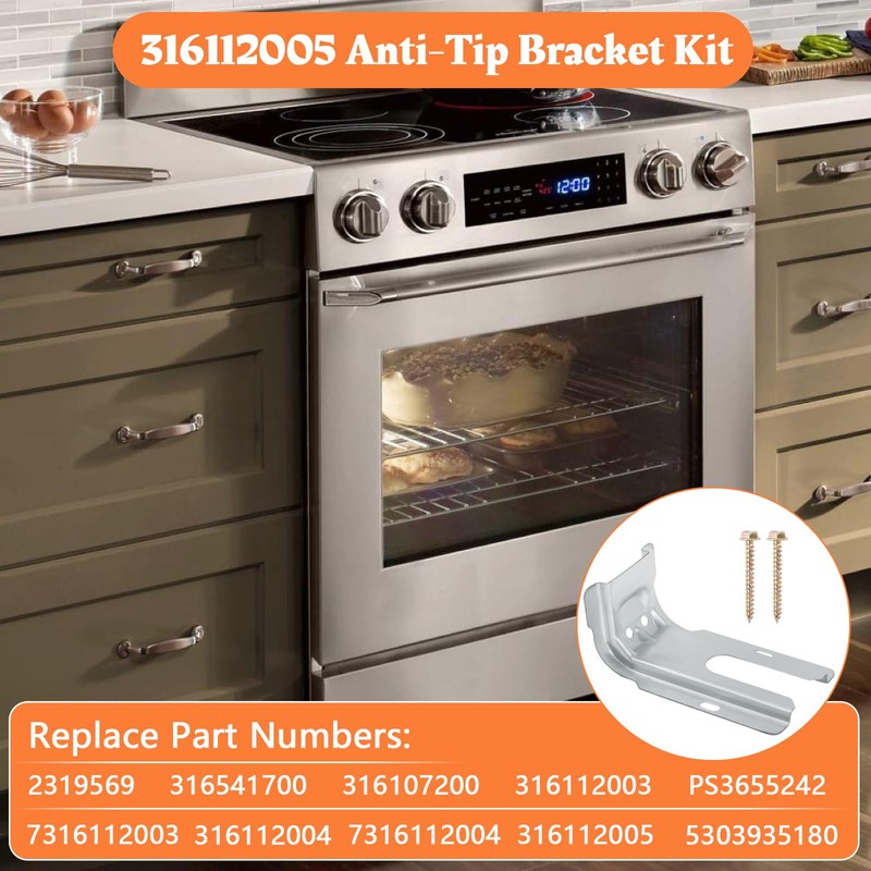 • Replace Part Numbers: 316112005 Anti-Tip Bracket Kit, replaces 2319569, 316541700, 316107200, 316112003, 7316112003, 316112004, 7316112004, 316112005, 5303935180, AP5630898, PS3655242