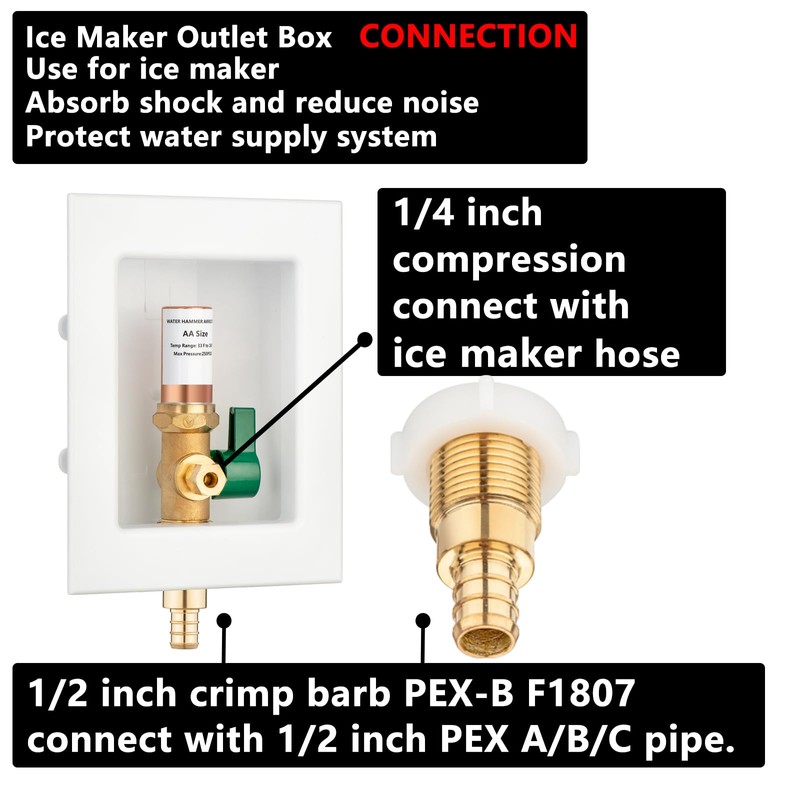 • Inlet: 1/2 inch Crimp PEX-B connect with 1/2 inch PEX A/B/C pipe. Outlet:1/4 inch compression connect with ice maker hose.