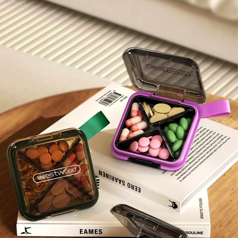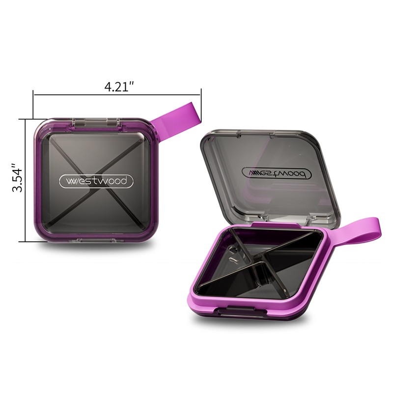 1 Pack Purple Pill Organizer with Strap, 4 Compartments, Compact Travel Pill Box Case, Portable and Moistureproof to Store Vitamins, Medication and Supplements