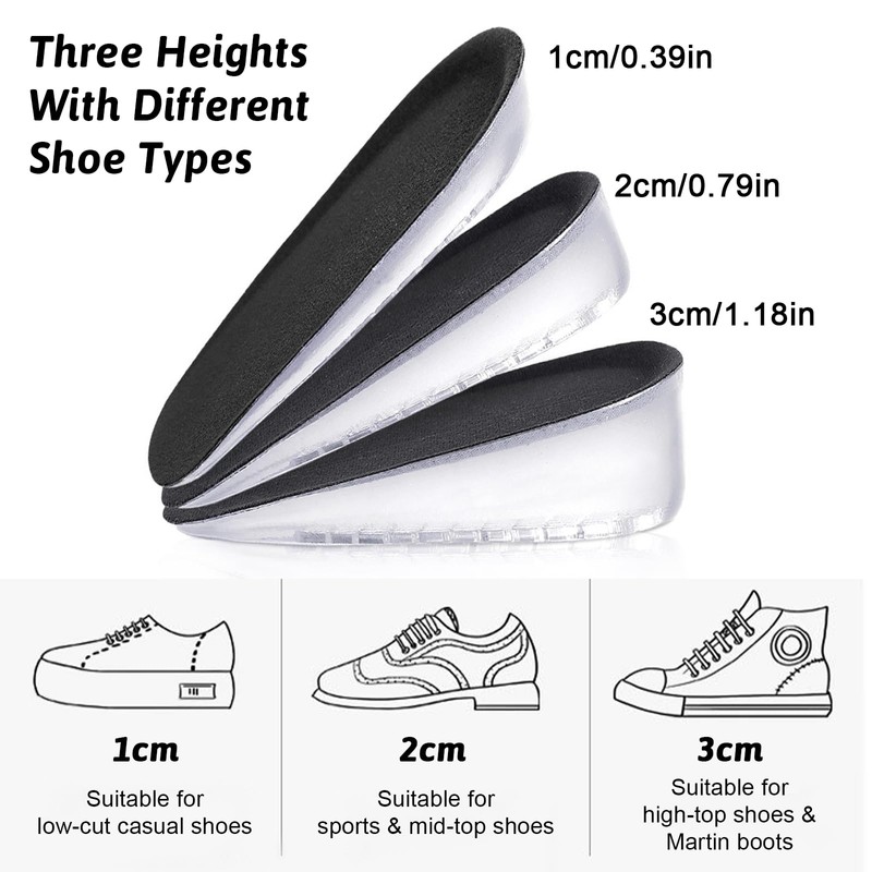 - Featuring a hidden height increase design, these insoles allow you to elevate your height while maintaining a seamless appearance. Whether it's a romantic date or a casual shopping outing, you can easily adapt to any situation.