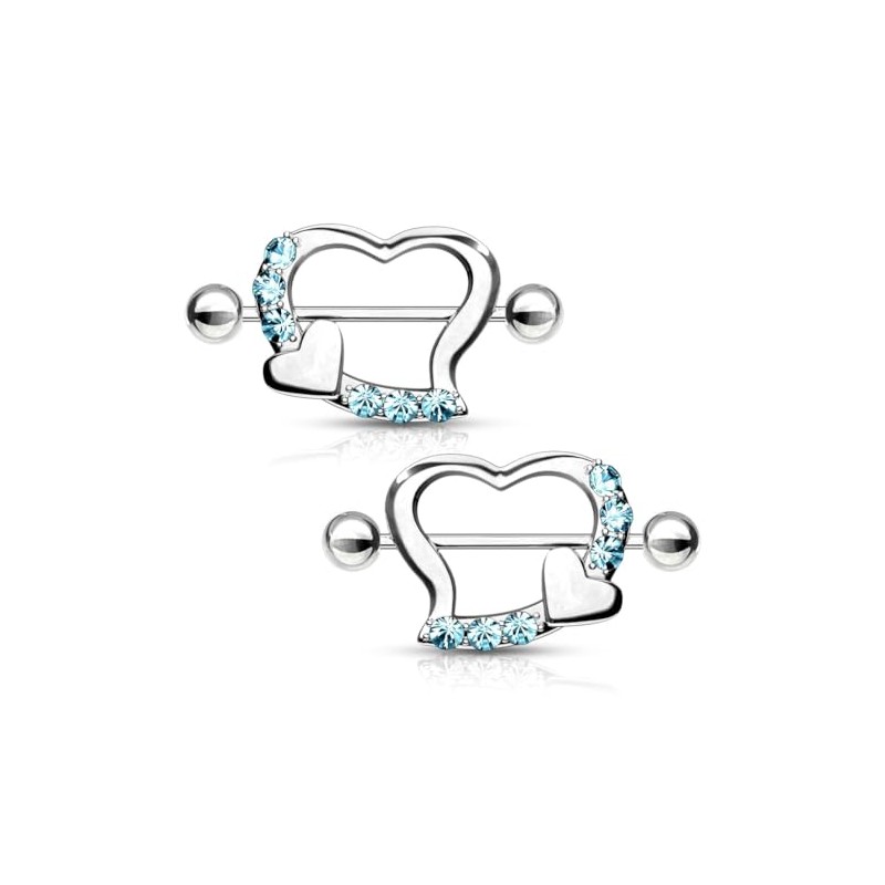 1 Pair Heart Surgical Steel Piercings with Crystals in Turquoise from Nipples - Nipple Shield