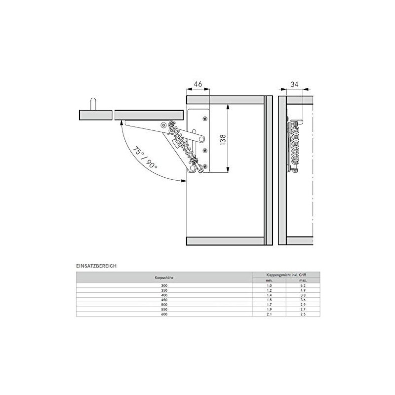 - Opening angle adjustable to 75° or 90 ° / Flap width: up to 1200 mm, Height: 300 - 600 mm