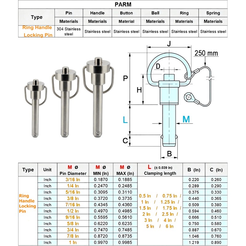 Product name:Stainless Steel Ring Handle Locking Pin Specs(Dia):3/16″,1/4″,5/16″,3/8″,1/2″