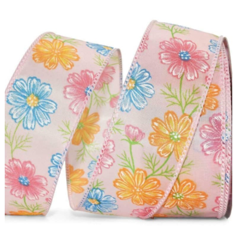 1 Pcs 1 1/2"W Spring Flowers Wired Ribbon Pink Yellow and Blue 5 Yards, Ribbon for Gift Wrapping | #AA120RK