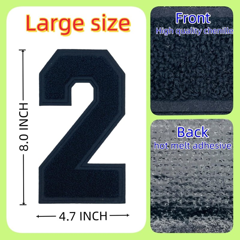 - Package Include: 1 Pcs Black chenille number patches, each measuring 8.0" tall (width varies by design). Perfect iron on patch for letterman jacket patches, varsity jackets, jeans, backpacks, personalizing jerseys and DIY projects.