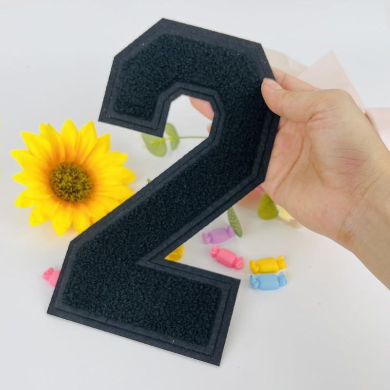 1 Pcs 8.0" Black Chenille Number Patches, Iron On or Sew On Appliques for Clothing, Jackets, Backpacks Varsity Style Large Number Patches Pair with Varsity Letter Patches (Black 2)