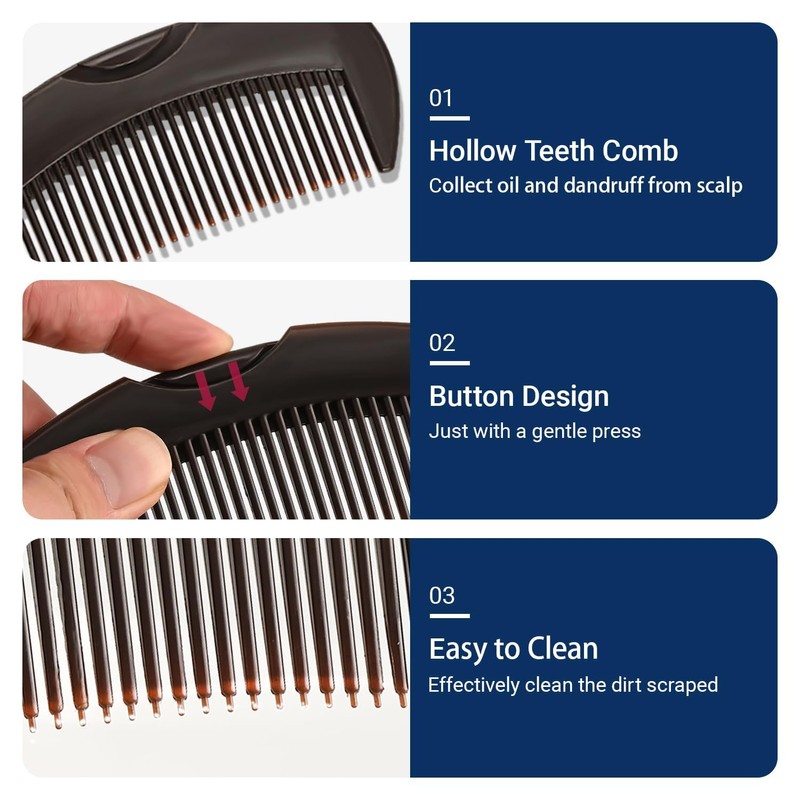 - Hollow Comb Design: Lightly press the top button to clean the dirt scraped from the scalp effortlessly, just need to wash it with water or alcohol and then dry it with a cotton cloth or paper towel