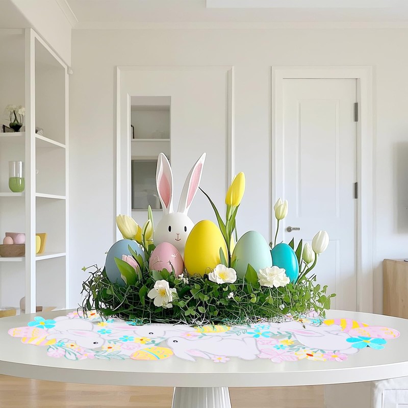 - Pattern: Colorful flower table runners placemats are in white and pink, blue and yellow and other colors. Colorful flowers and green leaves, elegant egg and rabbit elements, are Easter spring design styles. Bunnys patterns are cute and delicate, perfect for Easter and spring festivals