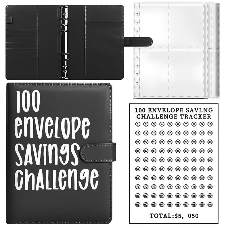 1 Piece of Black Binder, 25 Sheets of A5 Four-Square Grid Card with 100 Days of Paper, Photo Storage Book, Budget Binder, Suitable for Money Management, Travel, Diary and Office Use.