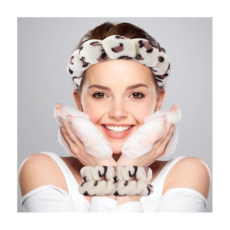 - 【Product Content】You Will Receive 1 Leopard Print Headband And 2 Leopard Print Wristbands. The Headband Is 18*18Cm In Size, The Color Is Beige White, And The Wristband Is Beige White, Which Is Suitable For Face Washing, Makeup And Beauty Use.