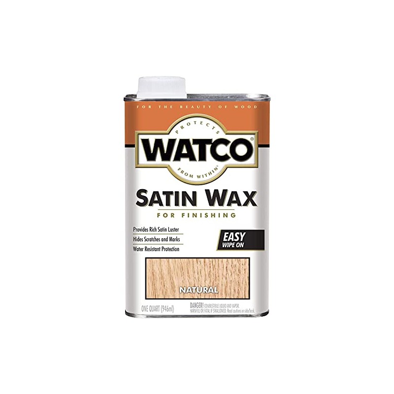 Watco Quart Natural Satin Finishing Wax. Easy to use liquid wax that gives interior woods a soft, satin luster. Completely clear for use with lighter stains, dark if a transparent look is desired. Helps hide scratches and is resistant to water. Additional applications applied periodically will maintain the luster and protect the wood for years. Not Available For Members In South Coast CA