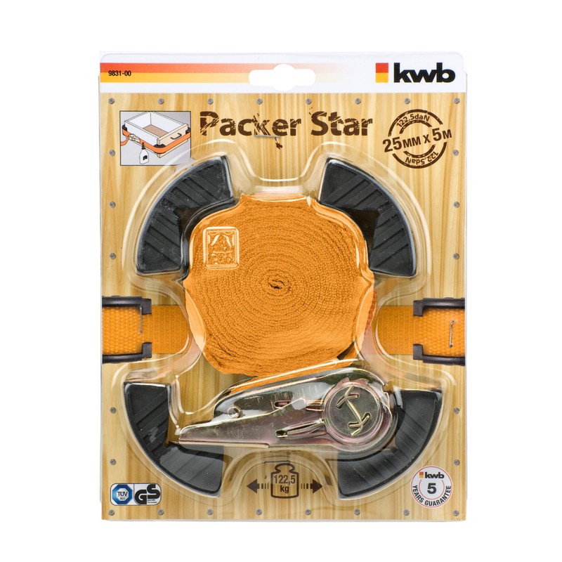 - The lashing belt is equipped with a metal ratchet which is protected against rust with a brass coating.