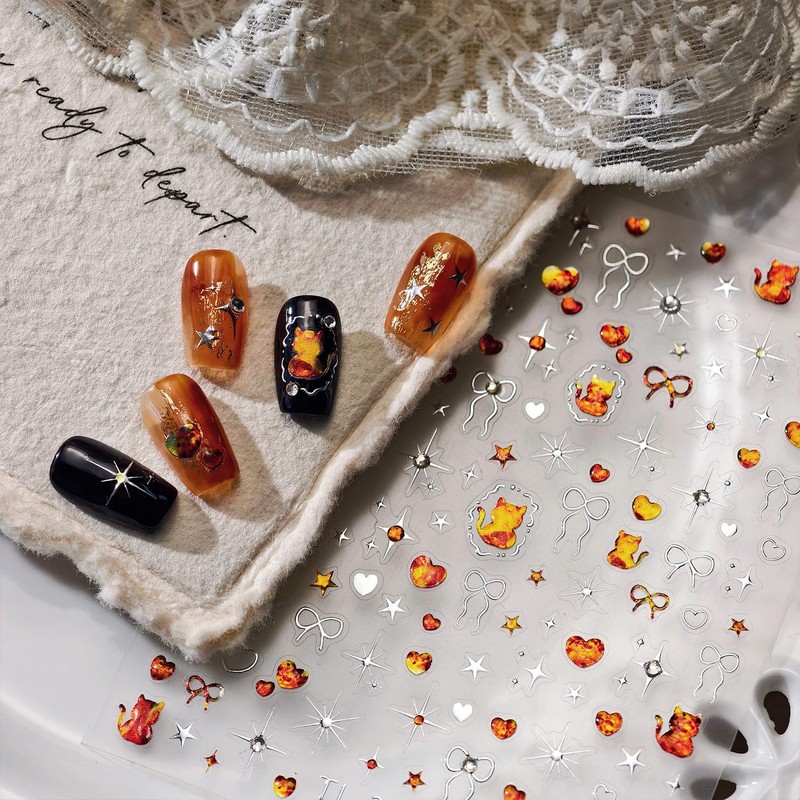 1 Sheets Embossed Cat Nail Art Stickers Self-Adhesive Silver Star Heart Bow Nail Stickers Cute Cat Nail Design Sticker 5D Bow Stars Nail Decals with Diamond for Women DIY Manicure Nails Decoration