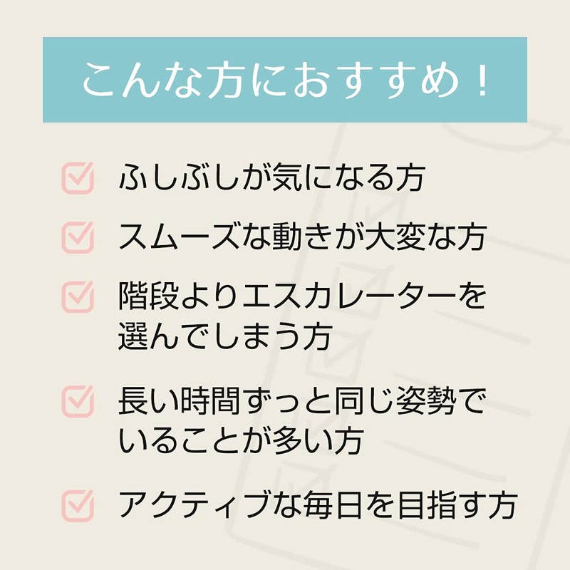 - 運動時の違和感が気になる方、若々しくありたい方、階段よりエスカレーターを選んでしまう方などにおすすめです。