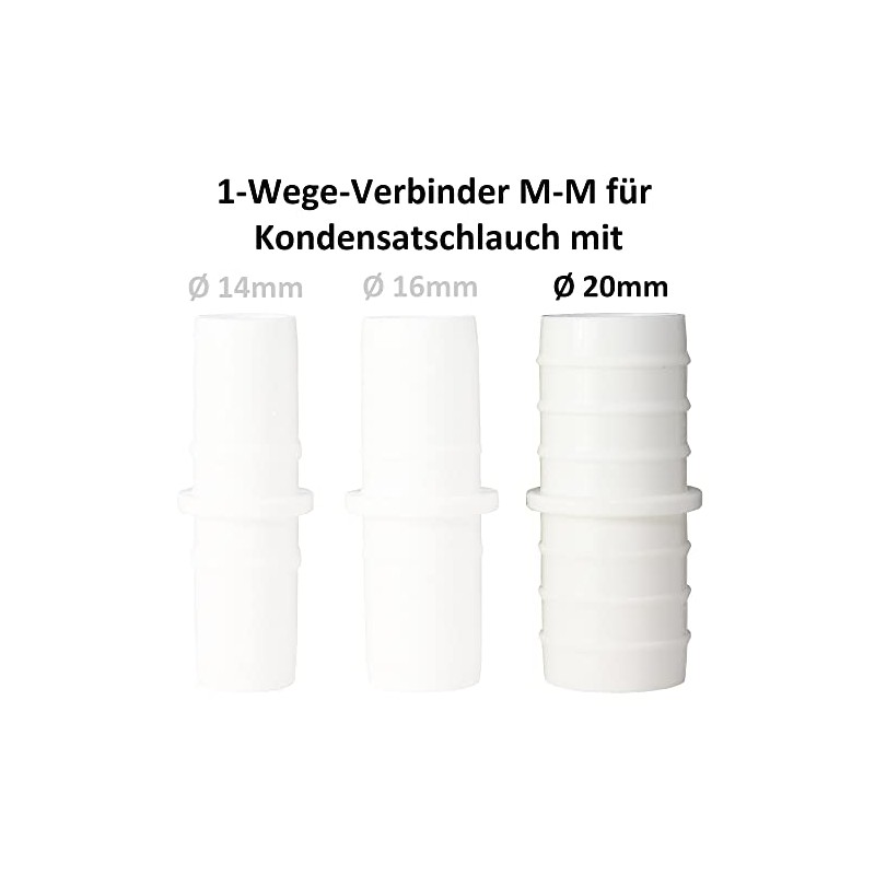 - This 1-way connector allows you to connect/connect two condensate hoses with a diameter of 20 mm