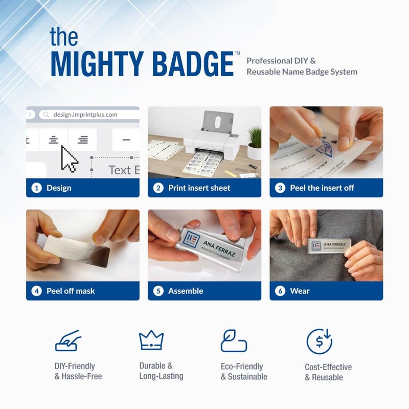 About The Mighty Badge: Our Reusable Name Badges Say goodbye to the hassle of traditional name badges and hello to a sleek, reusable solution that’s as innovative as your business. The Mighty Badge puts you in control, letting you design, print, and assemble professional-quality name tags effortlessly, right from your home or office. Transform the way your team represents your brand with The Mighty Badge, the ultimate customizable name badge solution. Whether you need professional employee badges or volunteer name badges for community events, The Mighty Badge ensures everyone feels recognized and connected. It's not just a name tag; it's a tool to elevate professionalism, foster confidence, and connect people—efficiently, creatively, and sustainably. Imagine crafting personalized badges on your own terms—no waiting, no complicated orders, just you and your vision. Thanks to our intuitive software, creating badges is as simple as designing, printing, and assembling them right from your home or office using a standard printer and computer. Add eye-catching logos, and stylish fonts to create a badge that feels as unique as your team members. Your brand, your way. What sets The Mighty Badge apart? It’s not just about convenience; it’s about making your team feel confident and connected. Each badge is a polished masterpiece, offering an eco-friendly and cost-effective way to maintain a professional image.