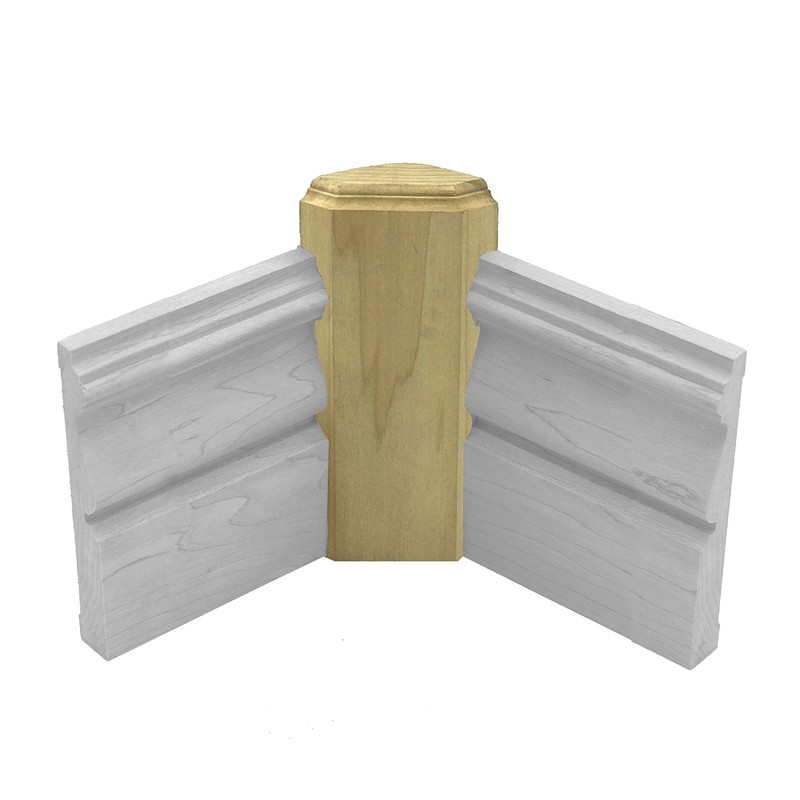 1" x 3" x 6" Poplar (paint grade) inside corner base block. These blocks create a decorative detail and prevent the need of an inside miter cut or a coping joint, making the installation of baseboard molding very easy. They fit with baseboards up to 5/8" thick by 5 1/2" tall, and can be cut shorter for a shorter baseboard. Unfinished ready to be painted or stained. Made in the USA by Bonneville Manufacturing.
