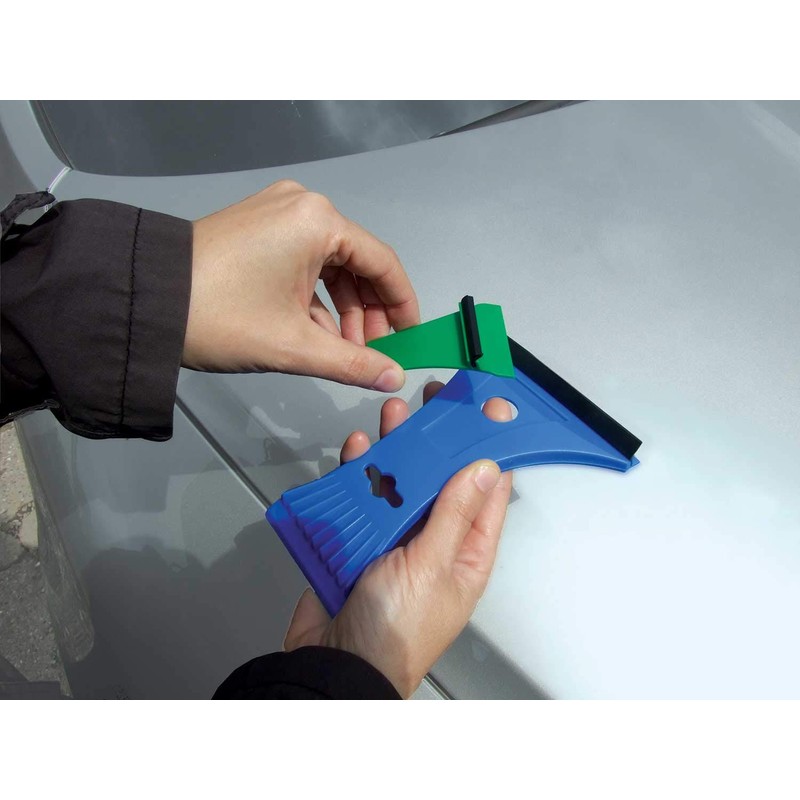 6 in 1 Ice scraper and squeegee. Includes pop-out mini scraper ideal for door mirrors and vehicle lights.