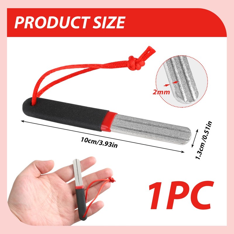 - Product size: Our double-sided hook sharpener measures 10 x 1.2 x 0.5 cm and is made of diamond material, which is wear-resistant and not easy to break, with different designs on both sides, which can be ground to different thicknesses to make the hook sharper.