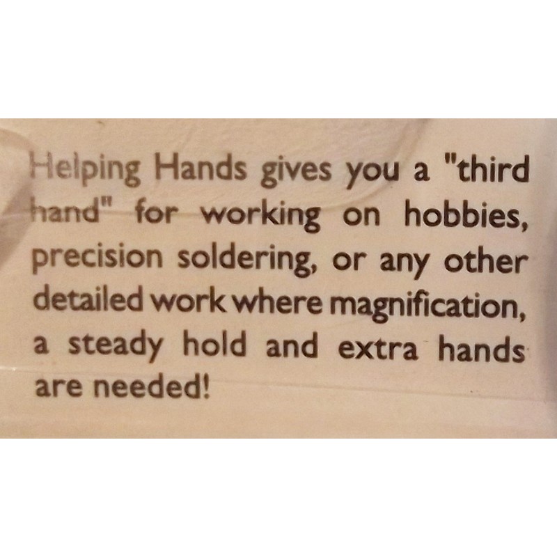 - Helping Hands gives you a "third hand" for working on hobbies, precision soldering, electronics projects or any other detailed work where magnification, a steady hold and extra hands are needed!