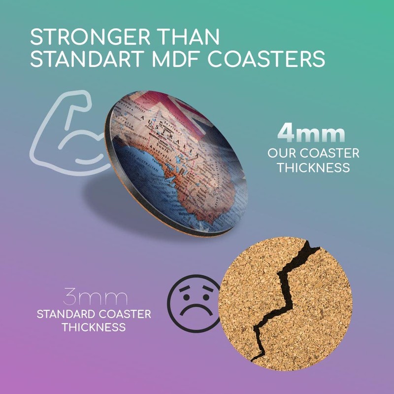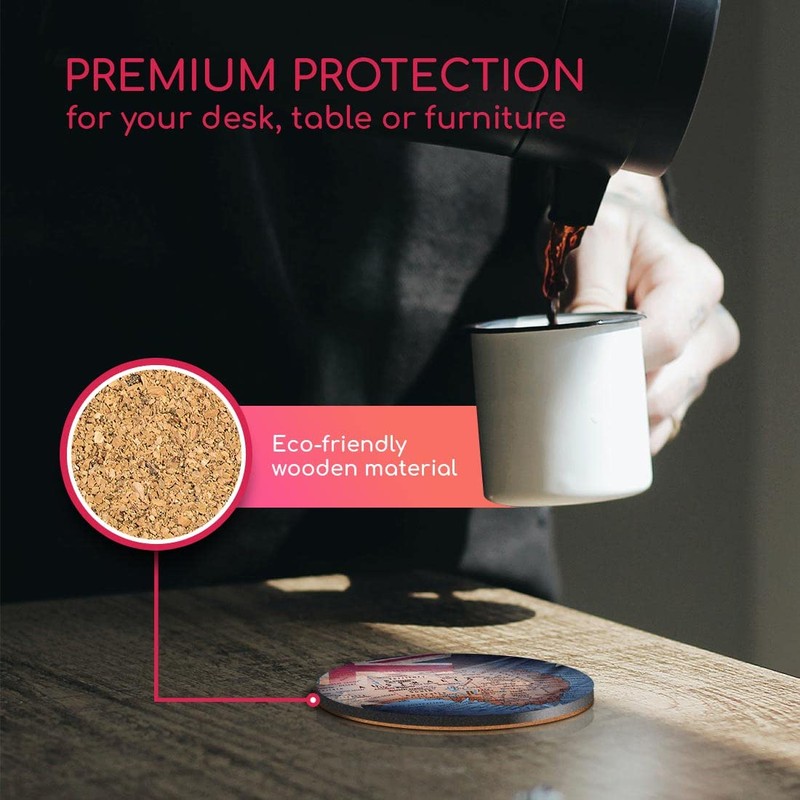 - Strong MDF Wood - The coaster upper layer is a glossy printed image, the middle layer is MDF wood, with a natural cork base to protect your dining table or office desk.