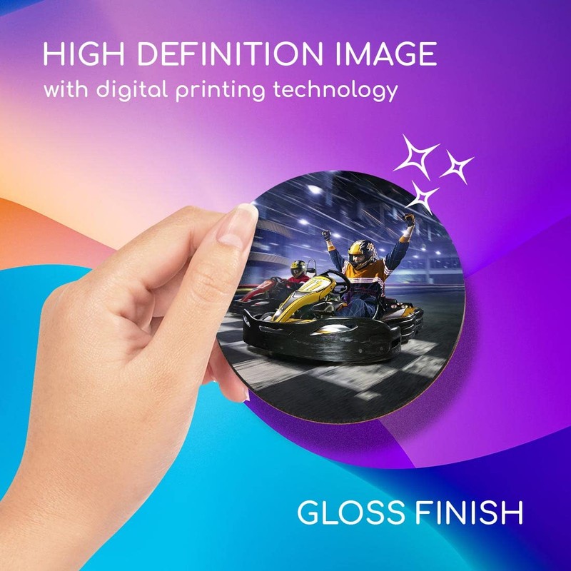 - Strong MDF Wood - The coaster upper layer is a glossy printed image, the middle layer is MDF wood, with a natural cork base to protect your dining table or office desk.