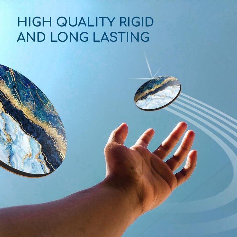 - Strong MDF Wood - The coaster upper layer is a glossy printed image, the middle layer is MDF wood, with a natural cork base to protect your dining table or office desk.