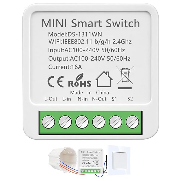 - Compact design: the mini smart switch blends seamlessly into your home without taking up space. Its unobtrusive design allows for easy integration into existing switches and sockets. (4.1 x 4.1 x 2 cm, neutral conductor required, AC 100-240V, 16A max)
