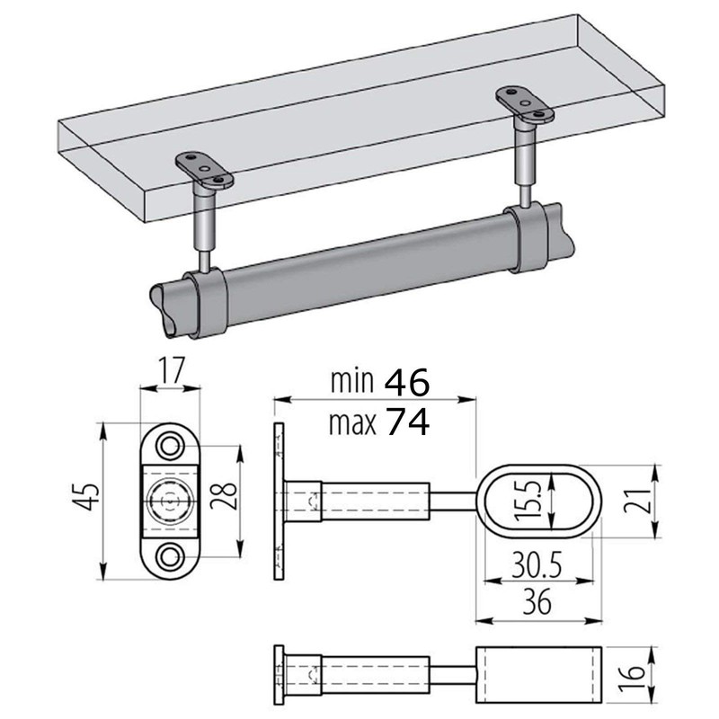 - Material: metal / surface: polished chrome / adjustable centre support / for oval cabinet rails 30 x 15 mm / height adjustable from 82 - 110 mm / for screwing on with chipboard screws countersunk head: 4.5 mm