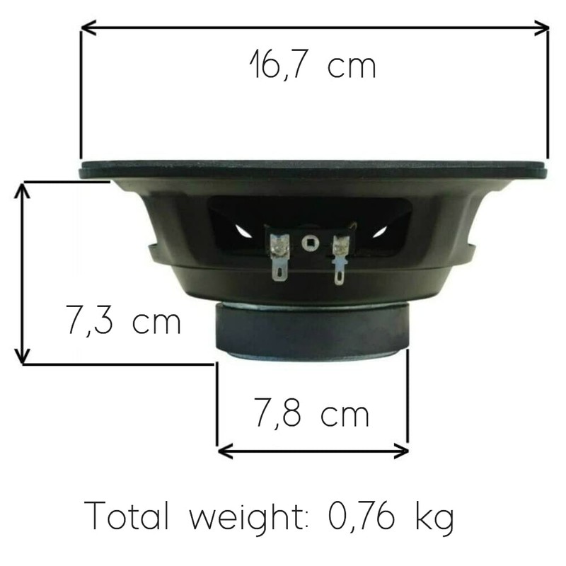 - Sold individually; woofer 16.5 cm diameter (6.5 inches) model J-64; RMS power: 75 watts; max. Power: 150 watts; Black cellulose membrane; Soft foam suspension; Impedance: 4 ohm; Speaker overall diameter: 16.7 cm;
