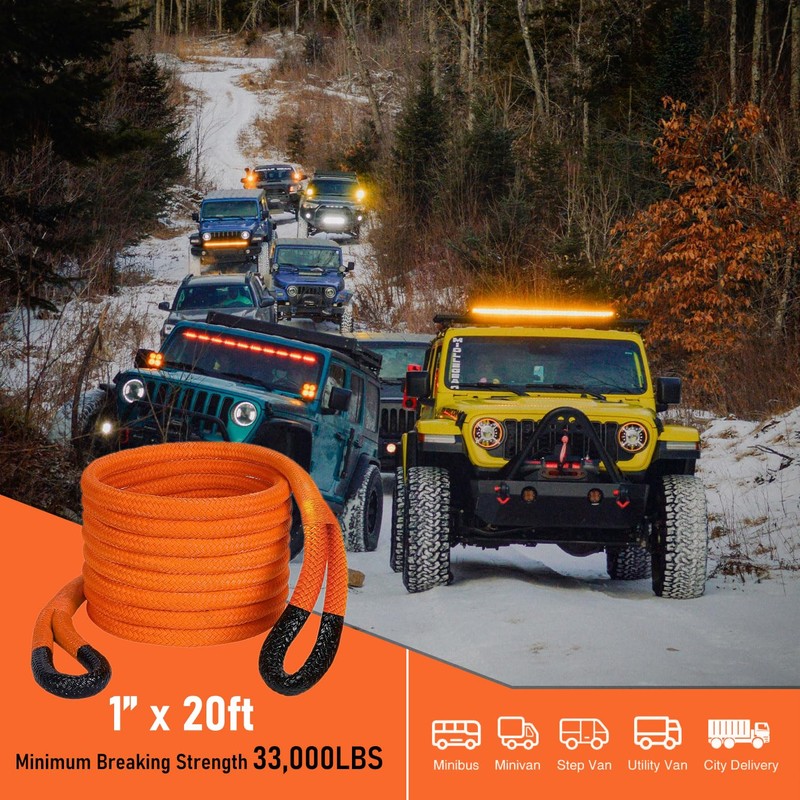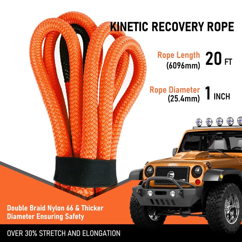 - Heavy-Duty Construction: 1"×20FT kinetic recovery tow rope with 48,000 lbs. max breaking strength