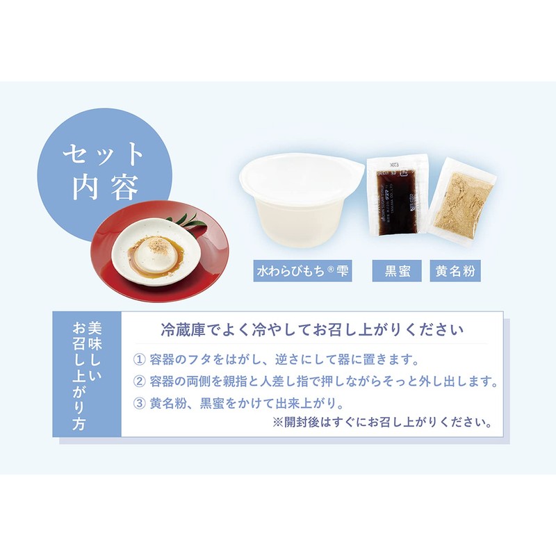- 原材料:【水わらびもち】砂糖(国内製造)、寒天、本わらび粉/ゲル化剤(増粘多糖類)【黒蜜】水あめ(国内製造)、黒糖、果糖ぶどう糖液糖、糖みつ【黄名粉】大豆(北海道産)